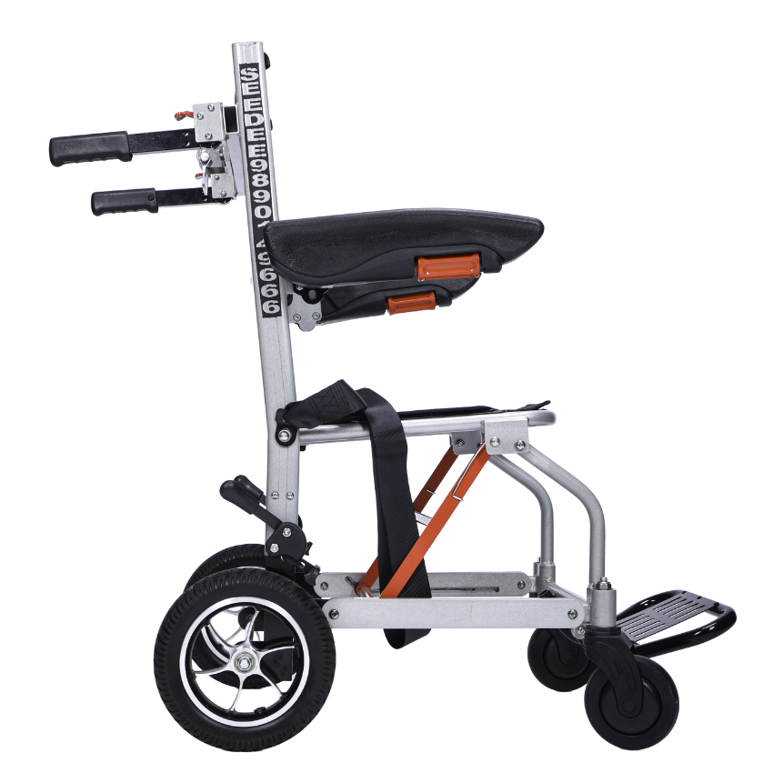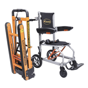 This stair climbing wheelchair comes pre-attached with 10″ big wheels which are not removable but give a much better and more comfortable ride to the client.